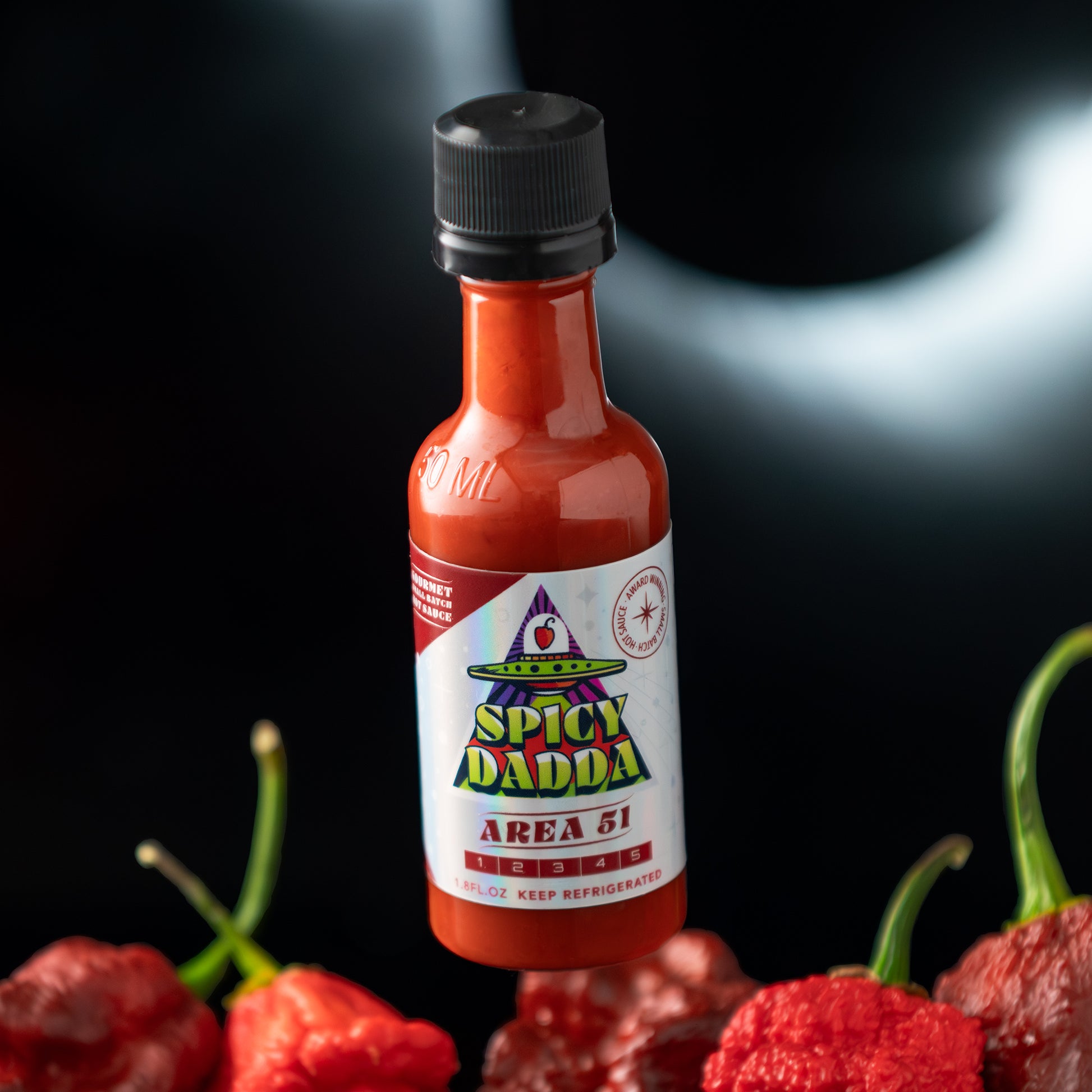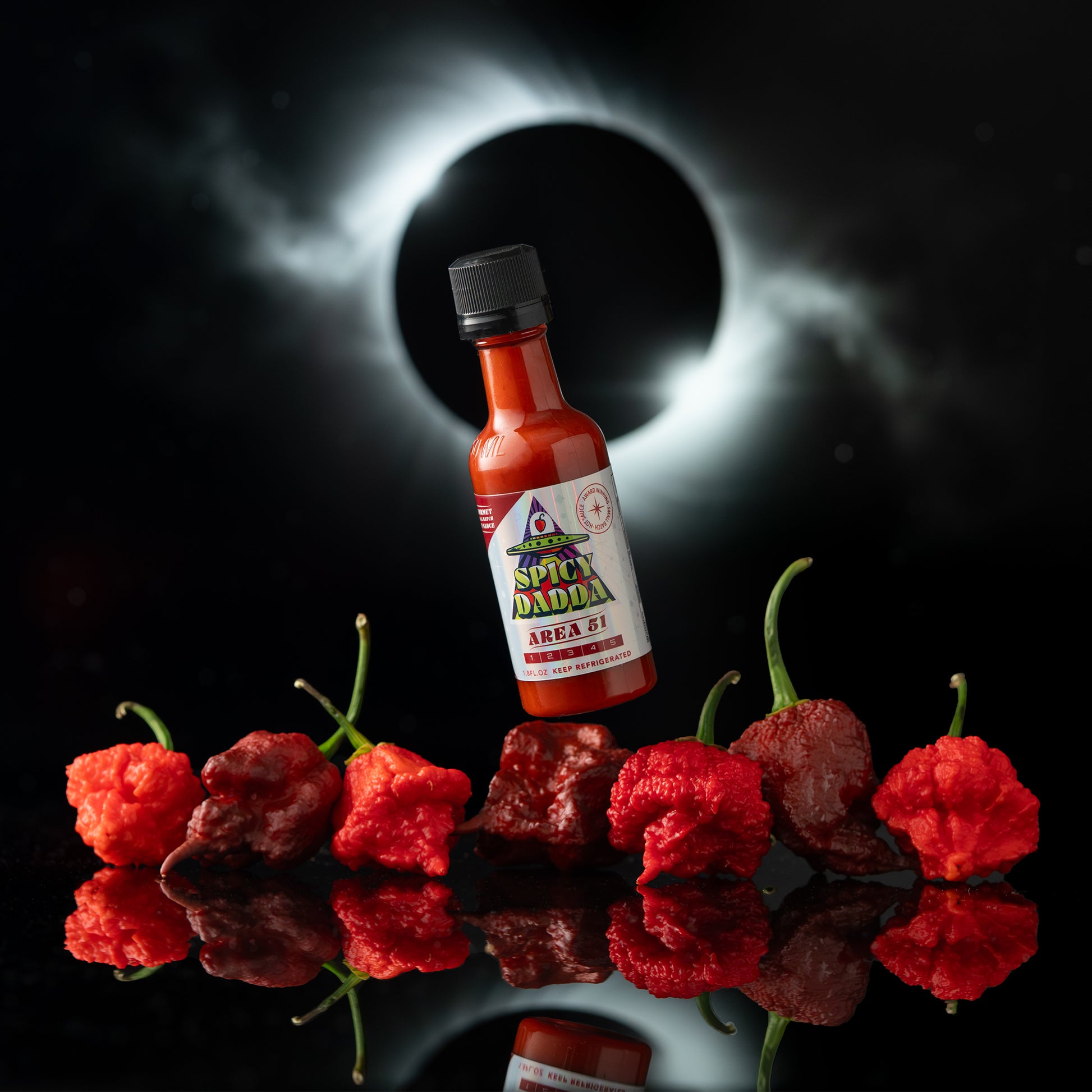 This bottle contains intergalactic heat seldom experienced by mankind. Highly classified. BEWARE: this is among the hottest sauces you can find without chemical extract. It's basically pure fermented pepper mash with just enough vinegar to get it out of the bottle. Sold in 1.8oz bottles.