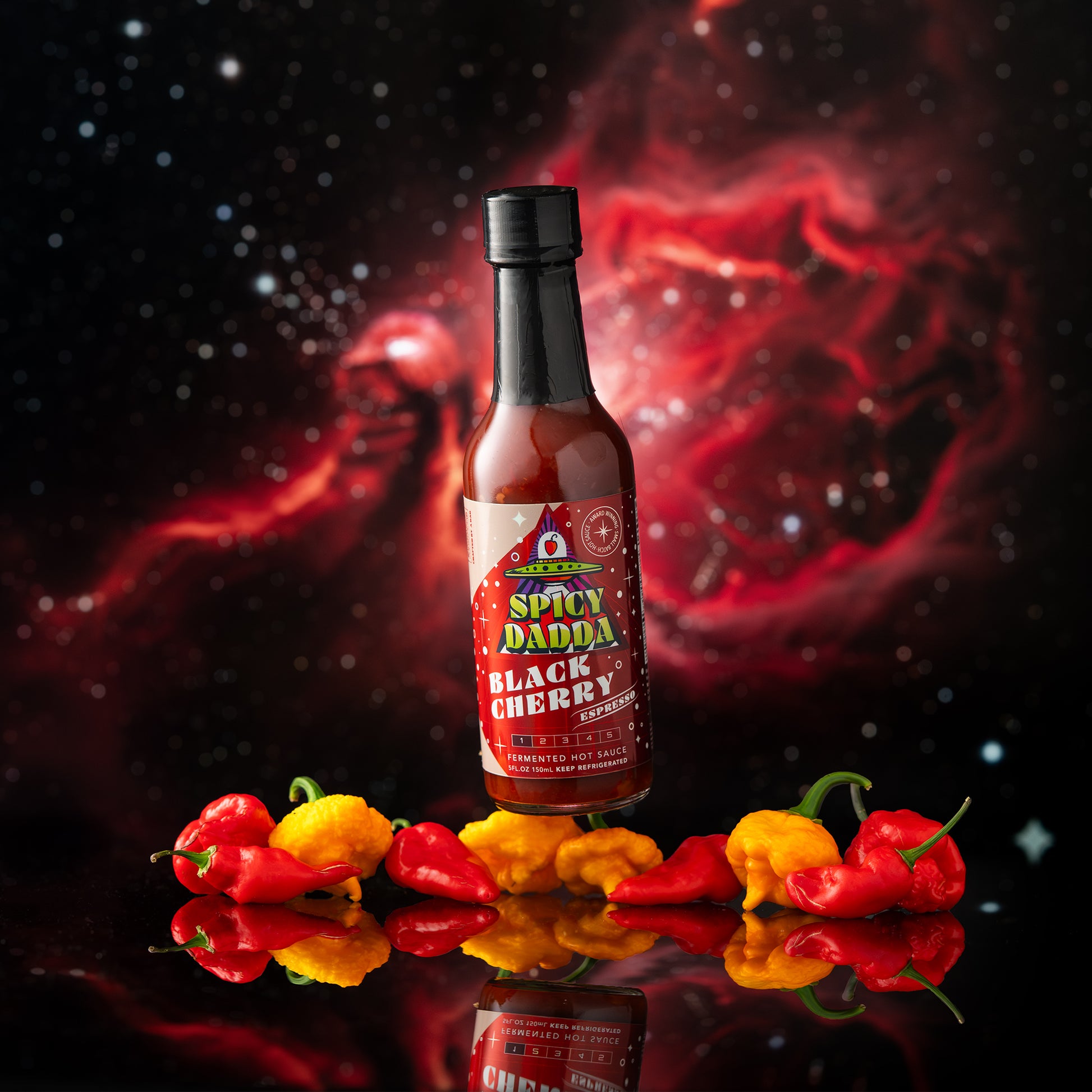 Prepare for a cosmic collision of flavors that's sending shockwaves across the galaxy! Our elusive Black Cherry Espresso has officially landed. Sweet Black Cherries, a bold kick of aged Espresso Infused Vinegar, fermented blend of Scotch Brains and Fox Ghost Ruby peppers, with an extra smooth finish from the pure maple syrup. It’s complex, it’s rich, it's a little out of orbit, and it’s dangerously delicious.