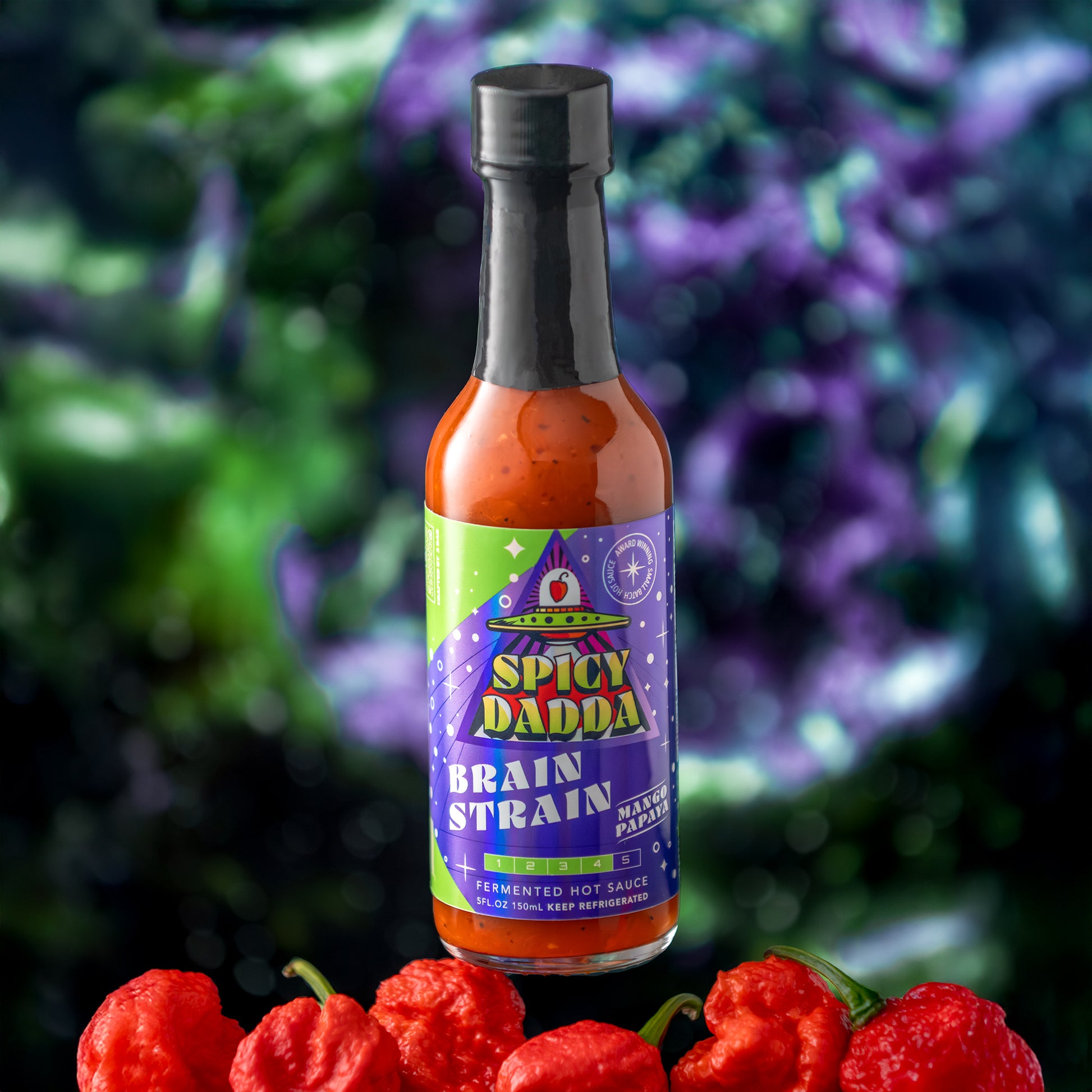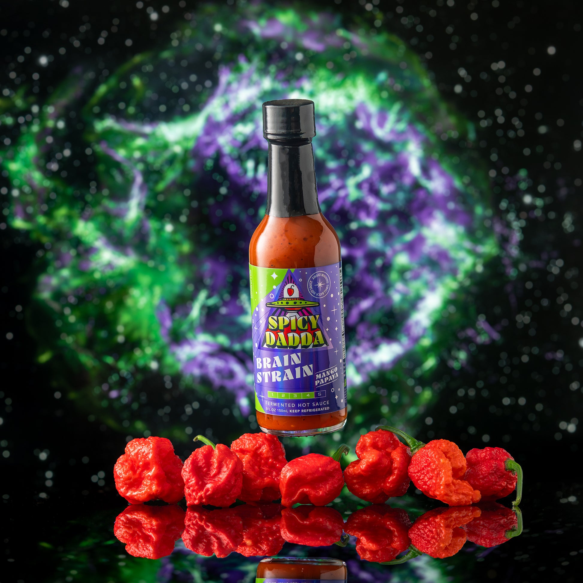 Brain Strain hot sauce is a unique blend of heat and tropical flavor. The brain strain peppers provide a strong, pungent kick. While papaya adds a sweet and refreshing touch. This sauce is perfect for adding some excitement to your favorite dishes. Try it on pizza, wings, burgers, steak... literally any meal that needs a spicy and flavorful addition. Just make sure you have a cold beverage nearby to cool things down, because the heat might abduct you.